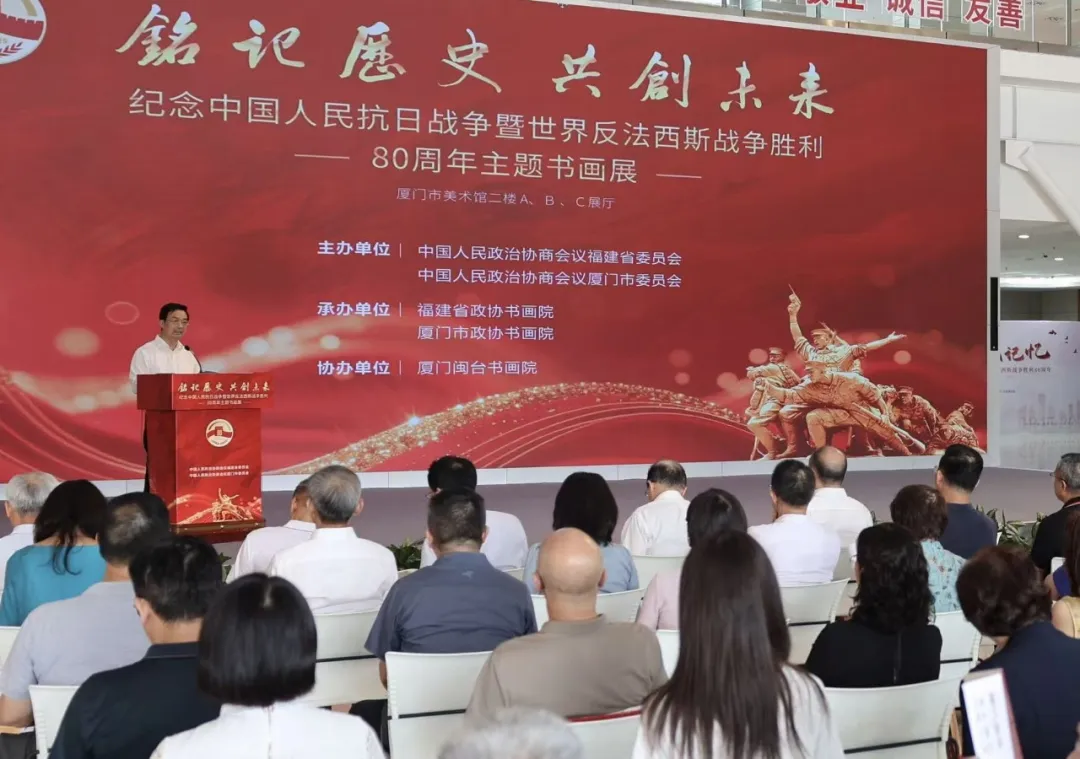 刘献祥在致辞中指出,要深入学习贯彻习近平总书记在纪念中国人民抗日战争暨世界反法西斯战争胜利80周年大会上的重要讲话精神,传承和弘扬伟大抗战精神,踔厉奋发、勇毅前行,广泛凝聚起实现中华民族伟大复兴的智慧和力量。希望通过举办此次书画展,以笔为墨、以丹青为语,能够唤起大家对历史的敬畏、对和平的珍视,让两岸同胞的心贴得更紧,团结奋斗的劲鼓得更足,让伟大的抗战精神在新时代绽放更璀璨的光芒。